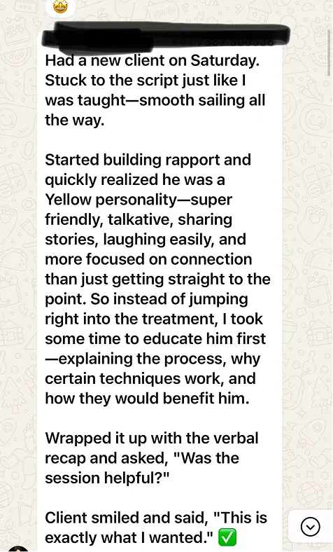 Understanding what the client really needs and offering an outcome-based treatment plan that gets them the result they came for.